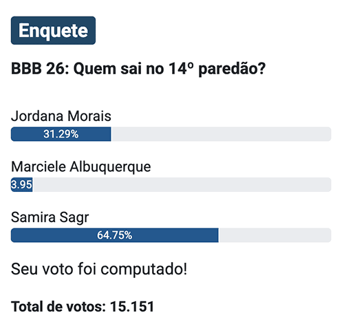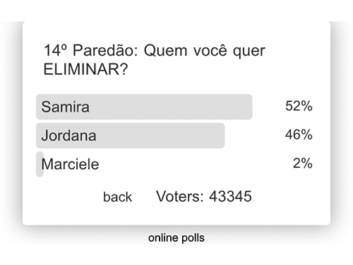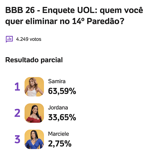 Na enquete do UOL, com 4.249 votos, Samira lidera com 63,59%, seguida por Jordana, com 33,65%, enquanto Marciele aparece com apenas 2,75%.