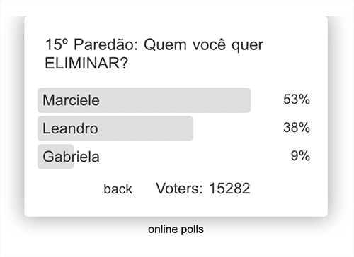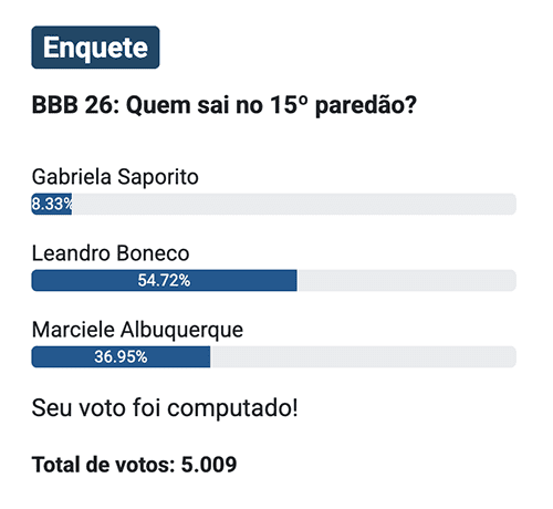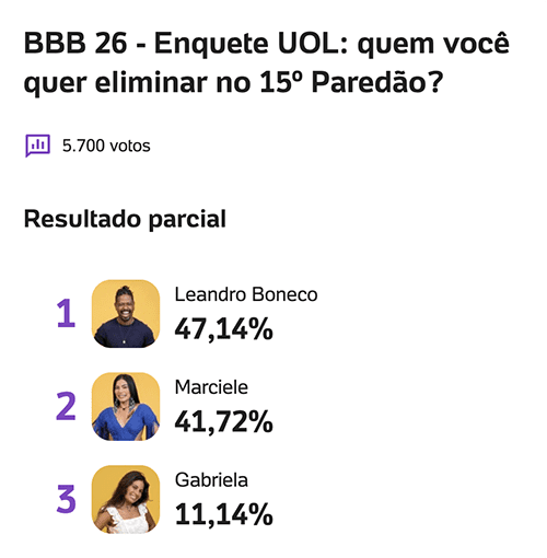 Na enquete do UOL, com 5.700 votos, Leandro Boneco segue na liderança, com 47,14%, enquanto Marciele aparece com 41,72%. Gabriela permanece mais distante, com 11,14%.