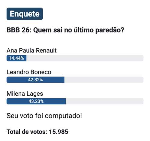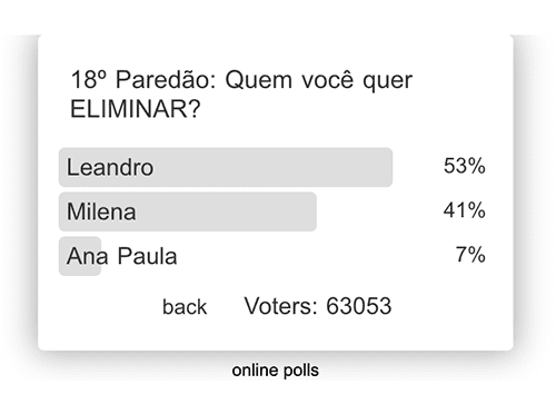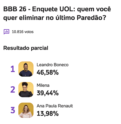 Na enquete do UOL, com 10.816 votos, Leandro aparece na frente com 46,58%, enquanto Milena tem 39,44% e Ana Paula soma 13,98%.