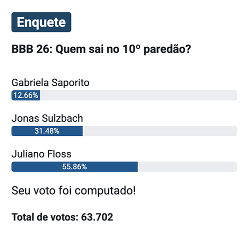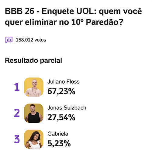 Na enquete do UOL, atualizada à 1h00 e com 158.012 votos, Juliano Floss disparou na liderança, alcançando 67,23%. Jonas aparece em segundo lugar, com 27,54%, enquanto Gabriela segue com 5,23%.