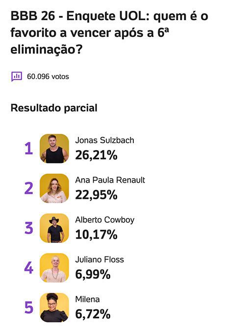 A nova enquete do UOL sobre quem deve ganhar o reality mostra mudanças importantes no favoritismo e aponta uma disputa cada vez mais concentrada entre alguns nomes.