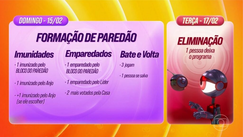 Já no domingo (15), a formação do Paredão será mais robusta. Estarão na berlinda: um emparedado pelo Bloco do Paredão, o indicado pelo Líder e os dois mais votados pela casa. Três deles disputam a Prova Bate e Volta — exceto o indicado pelo Líder — e apenas um se salva.