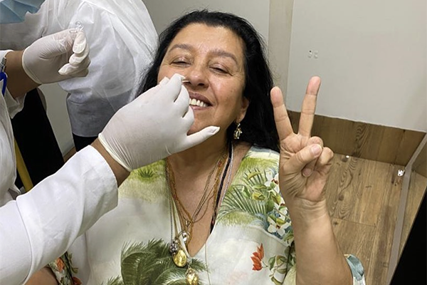 Ela publicou um vídeo em que se submete ao exame de PCR, onde um cotonete é inserido na via nasal para saber se a pessoa tem ou não coronavírus. Em conversa com a enfermeira, a atriz contou sobre a quantidade de exames que já tinha feito. “É o trigésimo”, revelou a veterana.