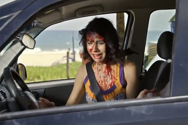 Um carro desgovernado, sem motorista, invade a ciclovia e atropela várias pessoas. Muitos pedestres correm de um lado para o outro, apavorados. Um grande engarrafamento provoca caos e pânico nas pessoas.