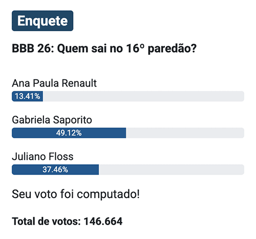 Já na enquete do Notícias da TV, também às 17h30 e com 146.664 votos, Gabriela lidera com 49,12%, enquanto Juliano soma 37,46% e Ana Paula aparece com 13,41%.