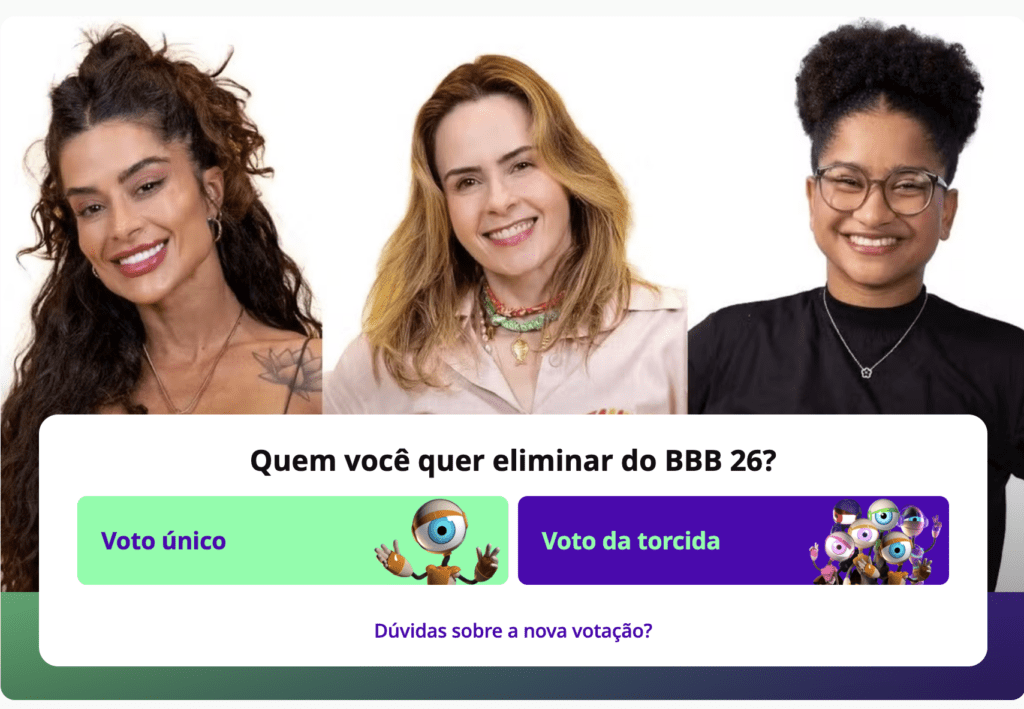 O BBB 26 teve uma mudança no formato de votação: o voto único, que é atrelado do CPF, ganhou mais poder, com peso de 70% na definição. Já o peso do voto da torcida, em que se pode votar quantas vezes quiser, passa a ser de 30%. O resultado, portanto, será a média ponderada dos dois formatos.