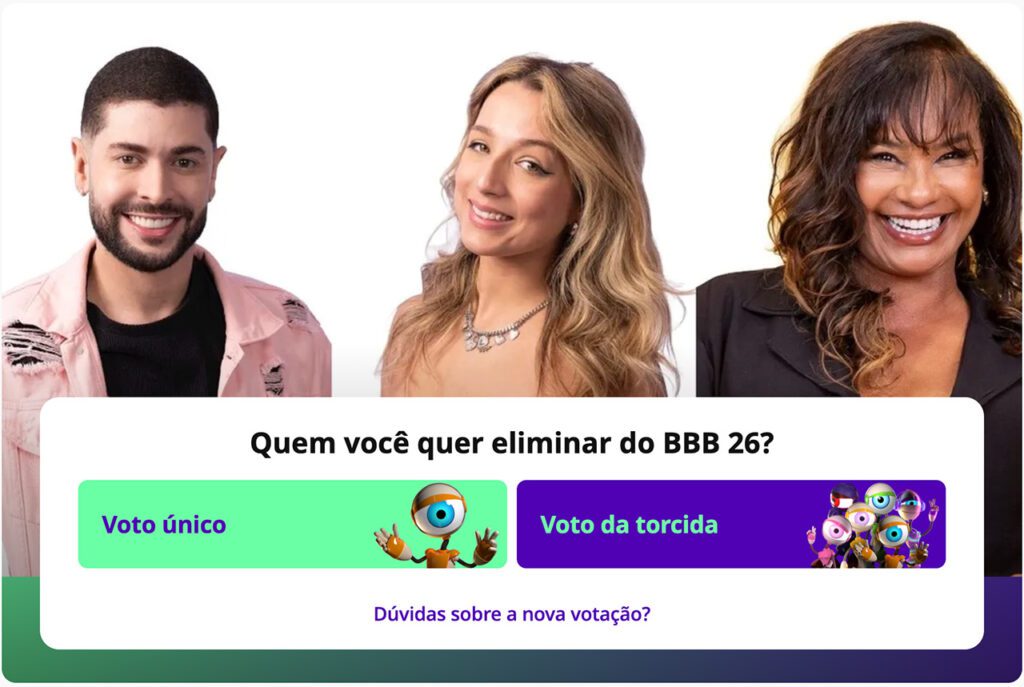 O BBB 26 teve uma mudança no formato de votação: o voto único, que é atrelado do CPF, ganhou mais poder, com peso de 70% na definição. Já o peso do voto da torcida, em que se pode votar quantas vezes quiser, passa a ser de 30%. O resultado, portanto, será a média ponderada dos dois formatos.